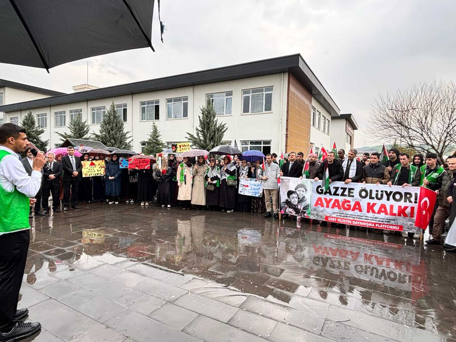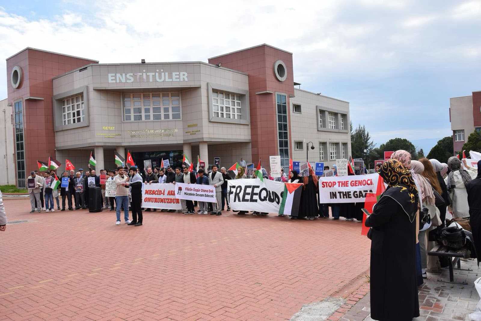 Üniversitelerde yapılan “Dünya Siyonizmden Kurtulacak” başlıklı ortak açıklamada, Mescid-i Aksa’nın 40 gün boyunca ibadete kapatıldığı belirtilerek, İsrail’in saldırganlığının tüm bölgeyi bir ateş çemberine sürüklediği ifade edildi. Açıklamada, “Lübnan'da sivil yerleşim yerlerine yağdırılan bombalar, Suriye'de bitmek bilmeyen istikrarsızlaştırma çabaları, İran'da 168 kız çocuğunun okuduğu okula yapılan zalim saldırı ve diğer saldırılar, sistematik bir soykırımın ve yayılmacı bir vahşetin dışa vurumudur. Apartheid İsrail, hiçbir aklın ve vicdanın kabul edemeyeceği bir suça daha imza atmıştır. İşgalci rejimin hapishanelerinde esir tutulan 12 bin masum Filistinlinin idam edilmesine yönelik insanlık dışı bir karar verilmiştir. Bizler bu kararı kabul etmiyoruz. Hiçbir hukuk ilkesine dayandırılamayan bu cani tutum, apartheid rejimin alçaklığını bir kere daha gözler önüne sermektedir.” denildi.