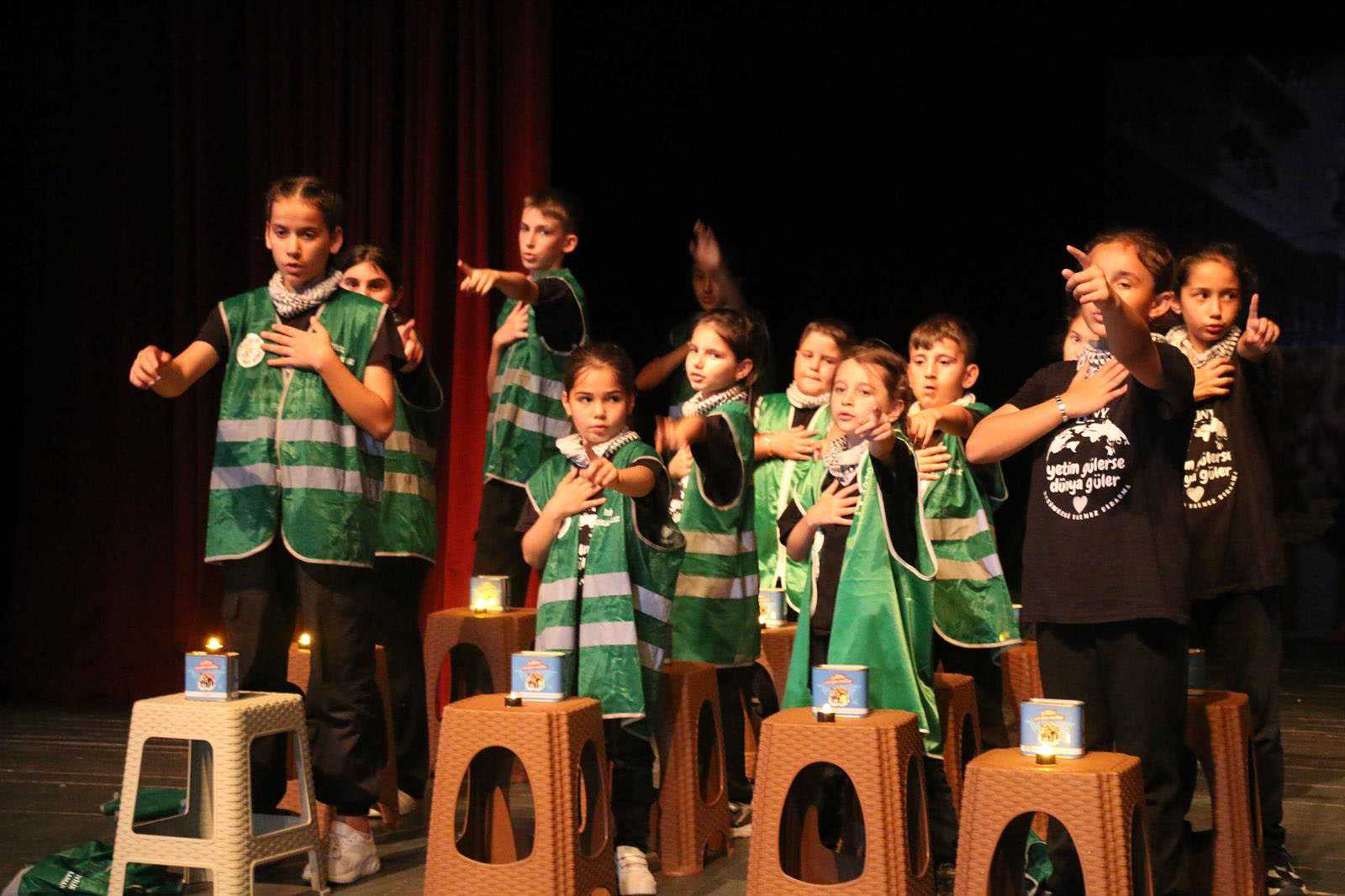 Sarıdere Kemeryanı İlkokulu’nda öğrenim gören 40 öğrencinin yer aldığı İyilik Tiyatrosu Topluluğu’nun sahnelediği oyun, Gazze’deki İsrail işgali sebebiyle büyük acılar yaşayan çocukların hikâyelerine odaklandı.