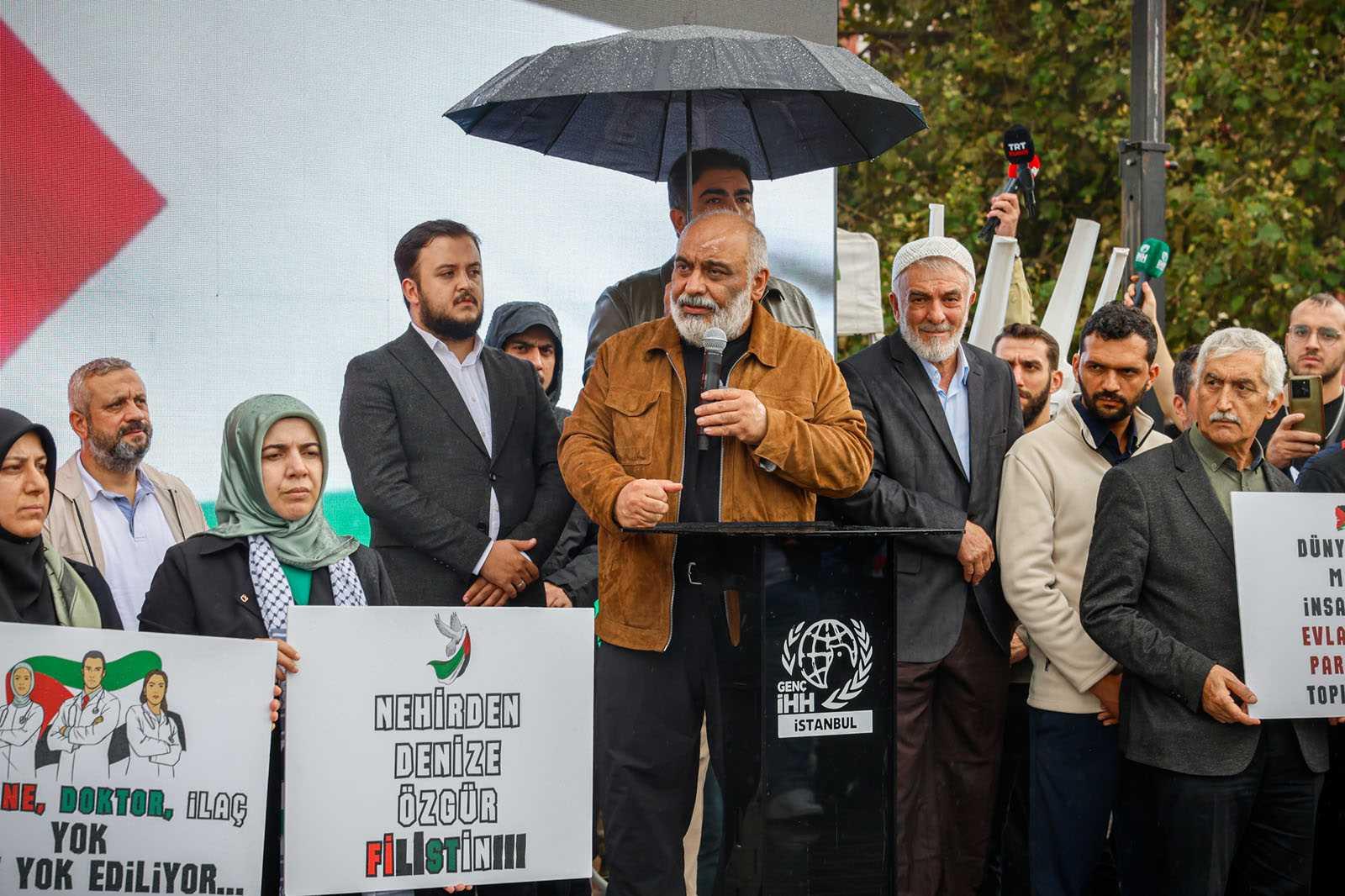 Basın açıklamasında konuşan İHH Genel Başkanı Av. Bülent Yıldırım, “Sumud’daki arkadaşlarımız haksız yere alıkonuldu. Netanyahu yüzünden Yahudilerin başları önüne eğik. Ben öncelikle Yahudilere sesleniyorum. Şu başbakanlık sarayı mıdır, meclis binası mıdır gidin oraları basın da Netanyahu’yu ve oradaki bakanlar kurulunu yaka paça dışarıya atın. Bu devrimi siz yaparsanız kendi milletinizi kurtarırsınız. Yoksa sizler her biriniz birer Hitler gibi anılacaksınız. Katliamcı olarak anılacaksınız. Çünkü katliam yapanlara sessiz kalanlar da katliamcıdır. Özellikle Türkiye’deki ve dünyadaki bütün hahamlar çıkıp basın toplantısı yapmalı ve demeli ki: ‘Zalim Netanyahu sen ne yapıyorsun?” ifadelerini kullandı.