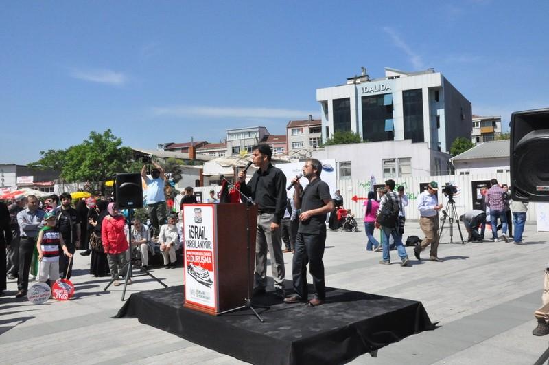 “Filistin’de Siyonist, Suriye’de Baas İşgaline Son!”, “Kahrolsun İsrail!”, “Filistin Özgür Oluncaya Dek!”, “İsrail İçin Hesap Vakti”, “İsrail Yargılanıyor!”, “Ölen Kardeşin Vurulan Sensin!”, “İsrael Under The Blockage of Justice!” yazılı dövizlerin taşındığı eylemde “Yaşasın Küresel İntifada!”, “Katil İsrail Hesap Verecek!”, “Birruh Biddem Nefdike Ya Aksa!”, “Mavi Marmara Onurumuzdur!”, “Ya Allah Menna Ğayrek Ya Allah!” sloganları atıldı.