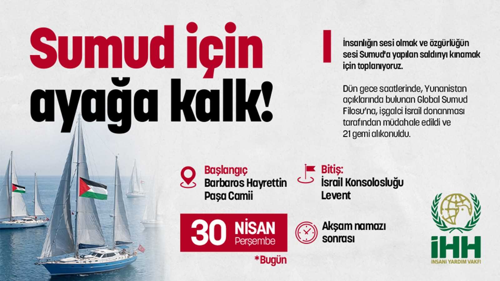 Filistin’in ve özgürlüğün sesi olan bu sivil girişime yapılan saldırıya karşı sessiz kalmıyor; Gazze’den Lübnan’a kadar uzanan bu zulme karşı tek yürek olduğumuzu haykırıyoruz. Saldırıyı lanetlemek ve alıkonulan gemilerin sesi olmak adına Barbaros Hayrettin Paşa Camii'nde kılınacak akşam namazının ardından İsrail Konsolosluğu önüne yürüyüş gerçekleştirilecek.