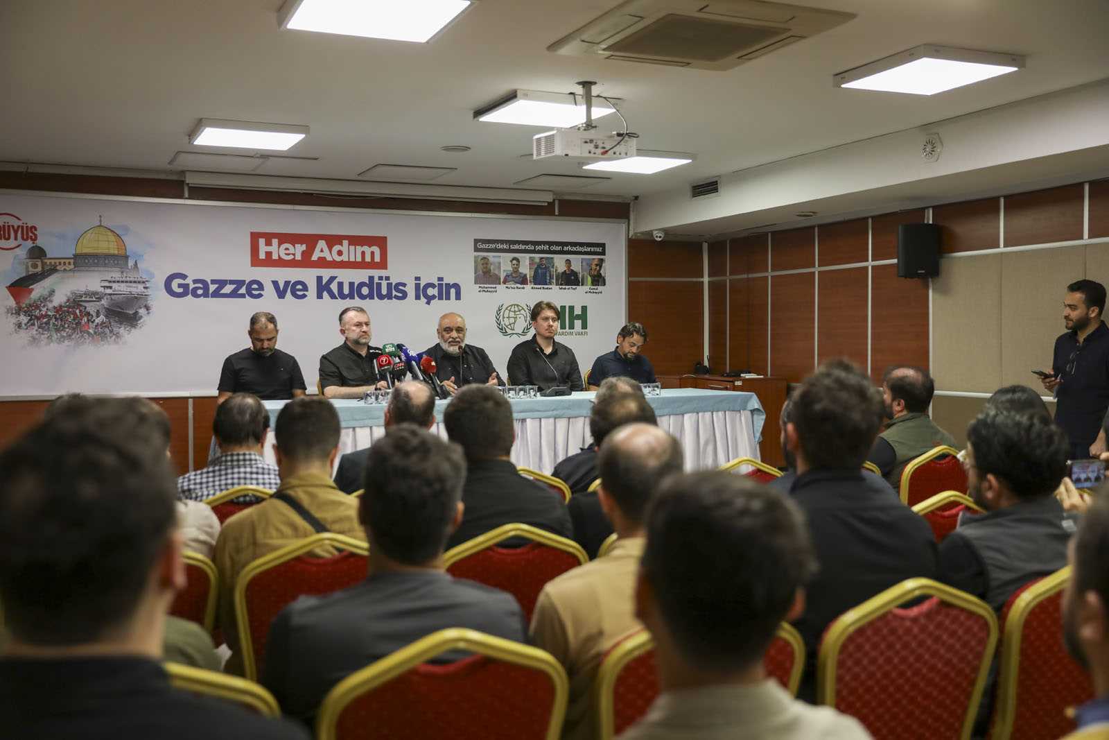 Basın toplantısı, İHH Genel Merkezi’nde düzenlendi. Basının yoğun ilgi gösterdiği toplantıda ilk olarak İHH Genel Başkanı Av. Bülent Yıldırım konuştu. 7 Ekim 2023’ten bu yana 11 İHH çalışanının şehit edildiğini belirten Yıldırım, “Ama bir arada en fazla şehit bu son saldırıda oldu. Arabayı bilinçli olarak vurdular. Amaçları insani yardımı önlemek. Gazze’de günlük 180 bin yemek çıkarıyoruz. Bu İsrail'i tedirgin ediyor. 7 Ekim 2023’ten bu yana 452 yardım kuruluşu çalışanı şehit edildi. Cenevre Sözleşmesi’ne göre, dünyanın neresinde bir yer abluka altındaysa uluslararası kuruluşlar oraya yardım ulaştırmak zorunda. Şu ana kadar devletlerin, askeri güçle karadan ve denizden ablukayı bitirmesi gerekiyordu. Uluslararası sözleşme bunu istiyor. Madem uygulamayacaktınız, o zaman o sözleşmeye niye imza attınız. Harekete geçmeniz için daha ne olması lazım. Daha ne kadar kadın ve çocuğun ölmesi gerekiyor?” ifadelerini kullandı.