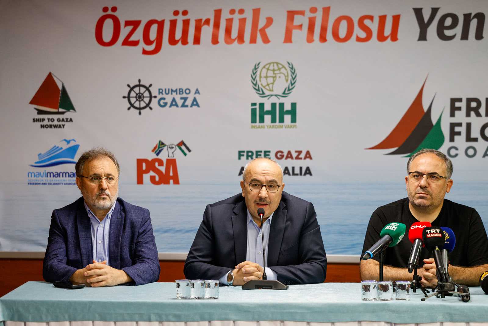 Türkiye’den İHH İnsani Yardım Vakfı ve Mavi Marmara Derneği’nin de paydaşı olduğu Uluslararası Özgürlük Filosu Koalisyonu’na bağlı gemiler, İsrail’in Gazze’deki ablukasını delmek ve insani yardım ulaştırmak amacıyla yola çıktı. Filoyla ilgili İHH Genel Merkezi’nde basın açıklaması düzenlendi. Basın açıklamasında konuşan İHH Genel Başkanı Av. Bülent Yıldırım, Gazze’de bir soykırım yaşandığını belirterek, “Bu soykırımı Amerika yapıyor. İsrail’i de tetikçi olarak kullanıyor. Dünyayı bir mafya yönetiyor. Bu mafyanın başkanı Amerika’da oturuyor. Amerika, dünya siyonizminin merkezi. Amerika halkı, Amerika’daki Siyonistlerden kurtularak özgürleşecek. Bütün dünya halkları, bu soykırıma tepki olsun diye yola çıktılar. Yeryüzünün her tarafında eylemler yapılıyor. Önümüzdeki birkaç gün içerisinde Roma’da büyük bir yürüyüş yapılacak, oraya da katılacağız. Buradan ilan ediyorum, 5 Ekim Pazar günü Ayasofya’dan Eminönü’ne büyük bir hareket gerçekleştireceğiz. Bu yürüyüşler Ankara’da da olacak, Türkiye’nin bütün yerlerinde de olacak. Nöbetler tutacağız meydanlarda, bütün Türkiye’yi harekete geçireceğiz” dedi.